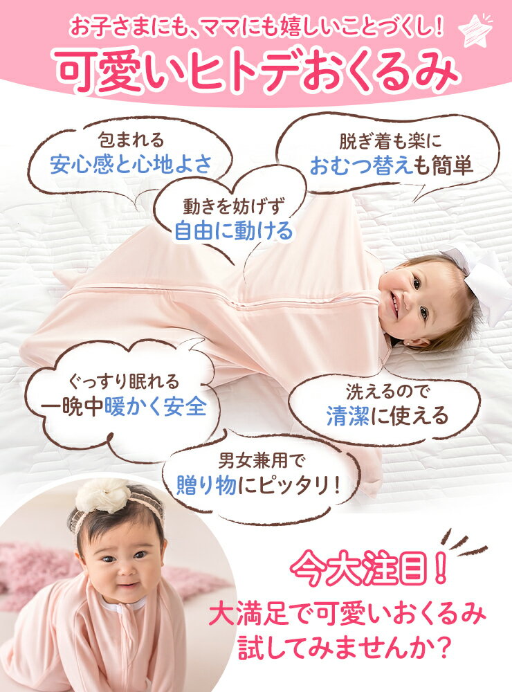 使い方は簡単】 複雑に折りたたむタイプのおくるみと違って、スリーピングスターは使い方がとっても簡単! 赤ちゃんをヒトデ形のスリーピングスターに入れてファスナーを上げるだけです。